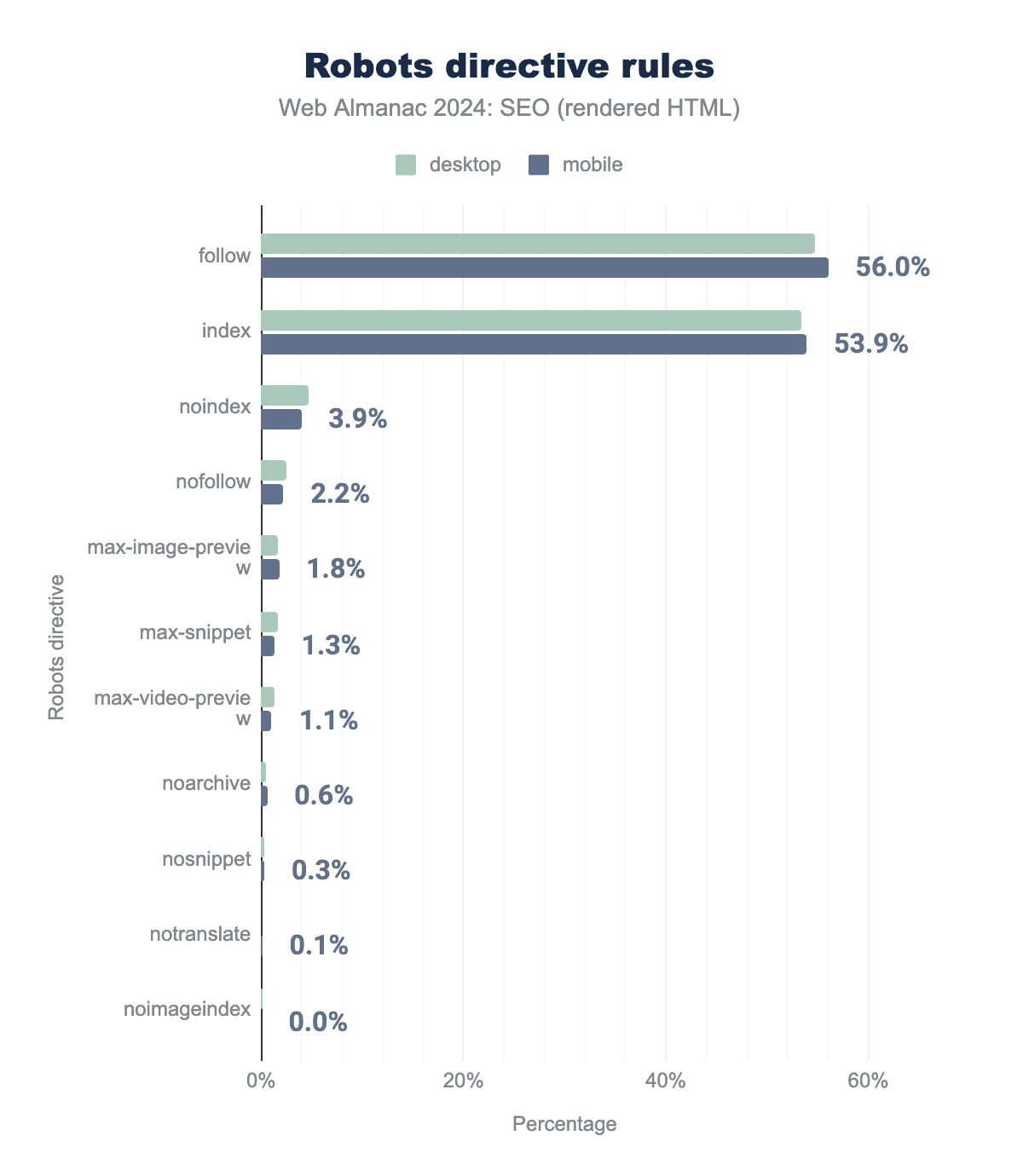 follow を使用、53.4%が index を使用、4.7%が nonindex を使用、2.5%が nofollow を使用、1.6%が max-image-preview を使用、1.6%が max-snippet を使用、1.2%が max-video-preview を使用、0.5%が noarchive を使用、0.2%が nosnippet を使用、0.01%が notranslate を使用、0.09%が noimageindex を使用。モバイルの割合も同様で、それぞれ56.0%、53.9%、3.9%、2.2%、1.8%、1.3%、1.1%、0.6%、0.3%、0.10%、0.01%。