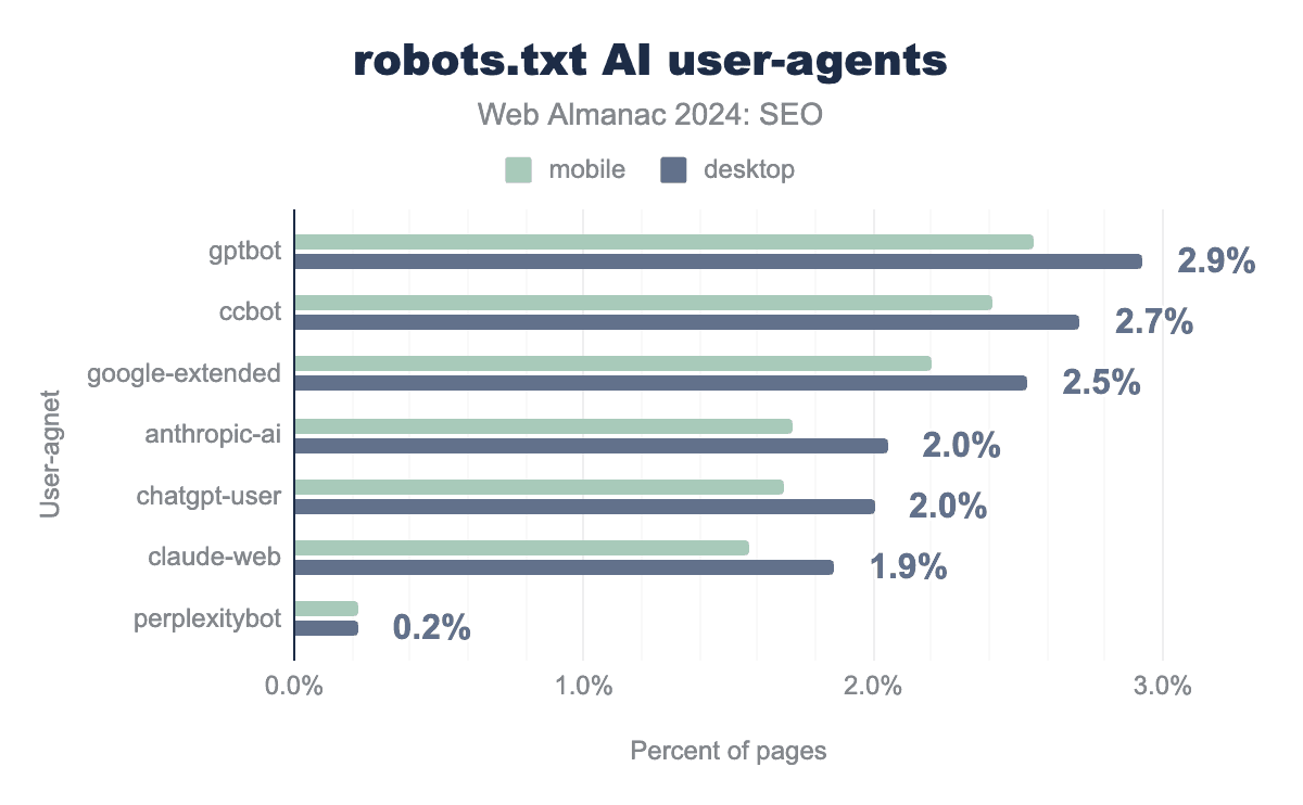 robots.txt ファイルでもっとも一般的なAIユーザーエージェントターゲットを示す棒グラフ。デスクトップでは、GPTBot が2.9%、CCBot が2.7%、Google-Extended が2.5%、Anthropic-Ai が2.1%、ChatGPT-User が2.0%、Claude-Web が1.9%、PerplexityBot が0.2%。モバイルの数値はデスクトップよりもわずかに低く、それぞれ2.6%、2.4%、2.2%、1.7%、1.7%、1.6%、0.2%。robots.txt AI user-agent の使用状況