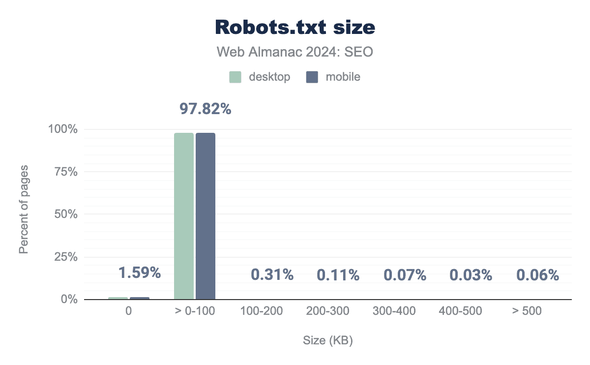 robots.txt ファイルの大多数—モバイルクロールの97.82%、デスクトップクロールの97.80%—は100KB以下でした。