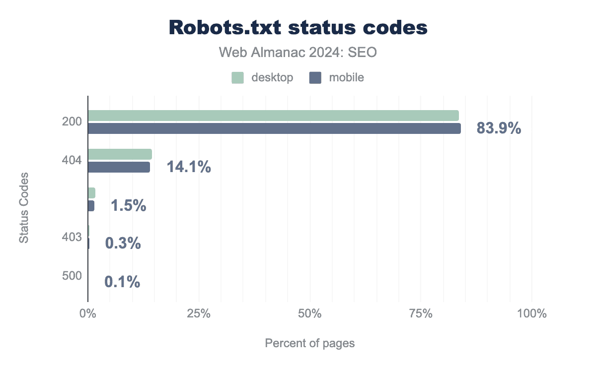 2022年には、モバイルサイトの robots.txt ファイルの15.8%とデスクトップサイトの16.5%が404ステータスコードを返していました。2024年現在では、モバイルサイト訪問で14.1%、デスクトップサイトで14.3%に減少しています。この減少は200ステータスコードを返す robots.txt の増加と一致しており、より多くのサイトが robots.txt ファイルを実装することを決定したことを示唆しています。