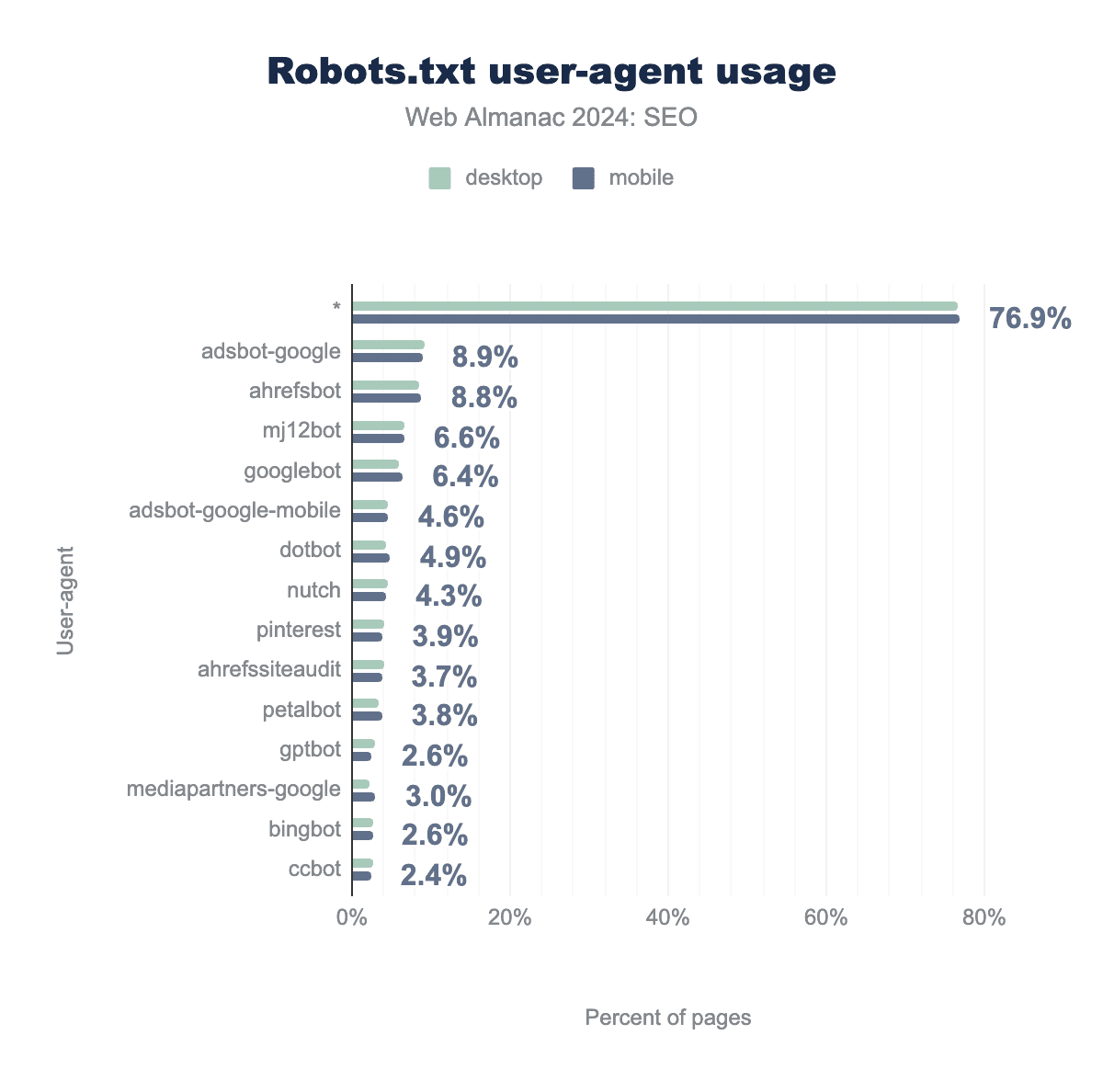 robots.txt ファイルでもっとも一般的な user-agent ターゲットを示す棒グラフ。デスクトップでは * が76.6%、AdsBot-Google が9.1%、AhrefsBot が8.6%、MJ12Bot が6.7%、Googlebot が5.9%、AdsBot-Google-Mobile が4.6%、Dotbot が4.4%、Nutch が4.5%、Pinterestbot が4.1%、AhrefsSiteAudit が4.0%、PetalBot が3.4%、GPTBot が2.9%、Mediapartners-Google が2.3%、Bingbot が2.6%、最後に CCBot が2.7%。モバイルはデスクトップと一致しており、それぞれ76.9%、8.9%、8.8%、6.6%、6.4%、4.6%、4.9%、4.3%、3.9%、3.7%、3.8%、2.6%、3.0%、2.6%、2.4%。robots.txt ユーザーエージェントの使用状況