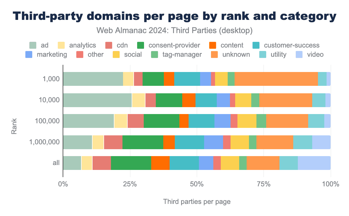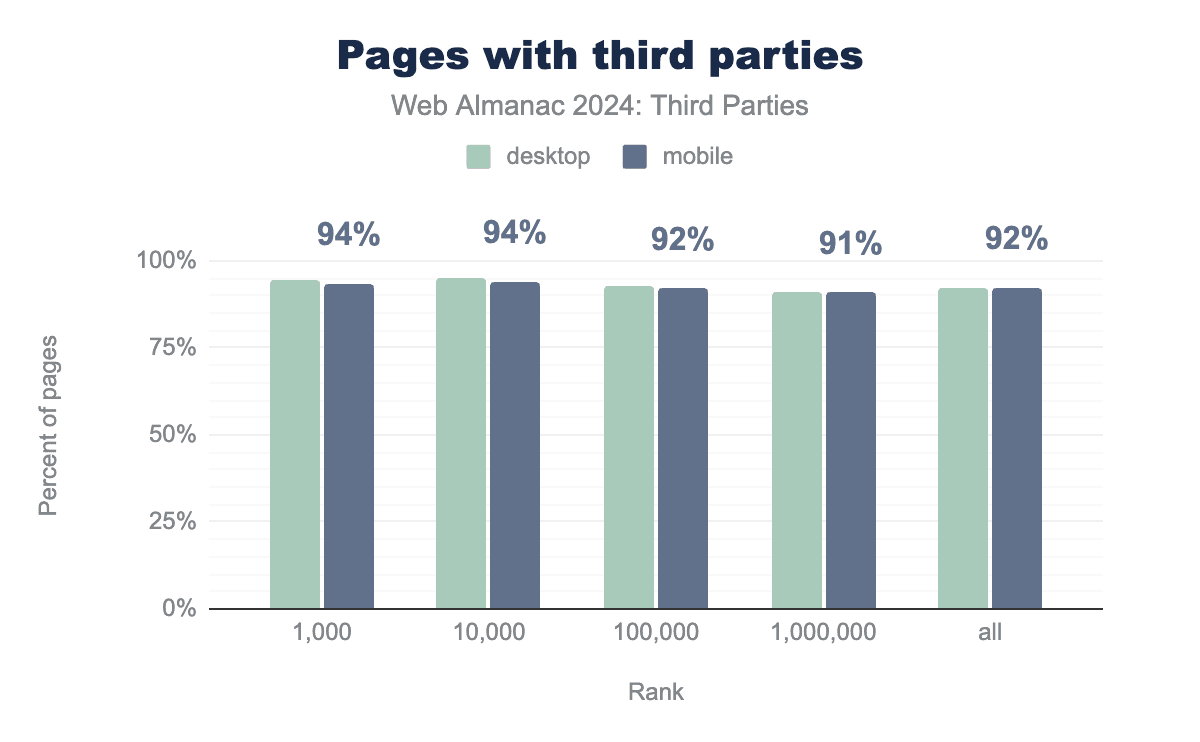 低ランクのウェブサイトでは、1つ以上のサードパーティを使用しているページの割合がわずかに減少しています。2021年と2022年と同様に、1つ以上のサードパーティを含むページの割合は92%と高いままです。