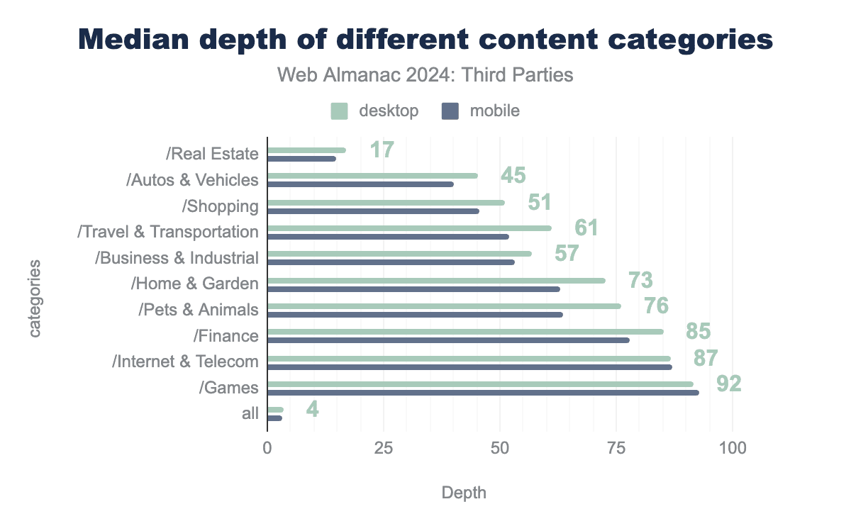 すべてのカテゴリで、デスクトップページはモバイルページよりも長い包含チェーンを持っています。異なるウェブサイトカテゴリ間で大きな違いが観察されます。もっとも長い包含チェーンを持つウェブサイトカテゴリは /Games です。