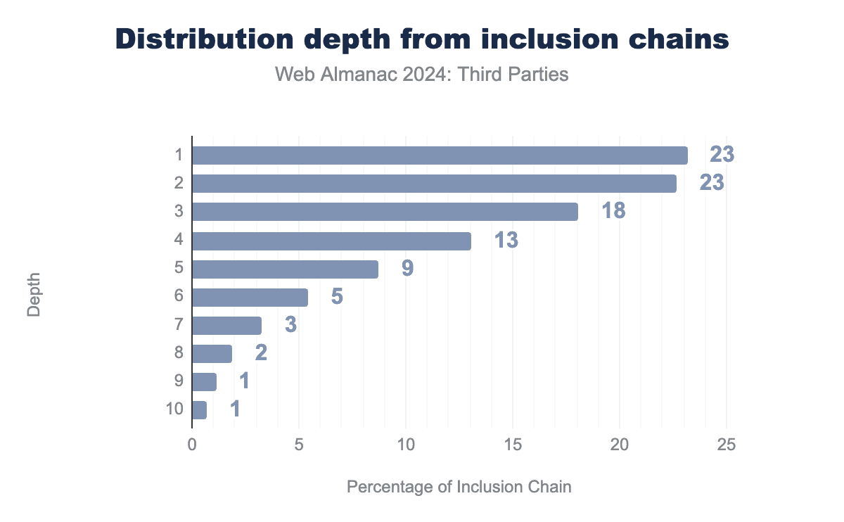 包含チェーンの中央値の深さは3です。包含チェーンの4%が長さ > 1で、これはページ上で少なくとも1つのサードパーティを間接的に含んでいることを意味します。とくに、包含チェーンの14%が長さ > 5です。もっとも深い包含チェーンの長さは2,930です。