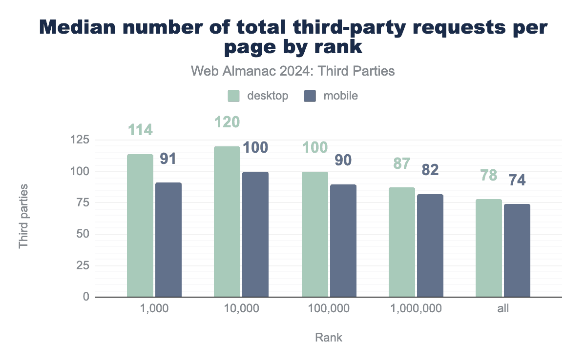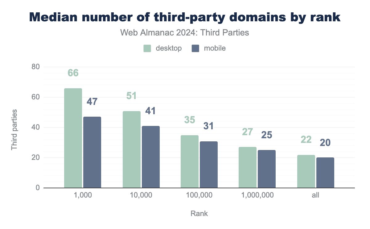 低ランクのウェブサイトでは、サードパーティの数がかなり減少していることがわかります。トップ1000のウェブサイトではサードパーティの中央値が66、トップ100万のウェブサイトでは27です。デスクトップのサードパーティ数はモバイルページよりも多くなっています。デスクトップとモバイルの差は、より上位のウェブサイトで大きくなっています。