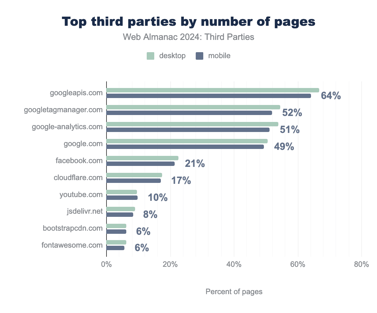 サードパーティは、ファーストパーティによって直接含まれていないことが多いことがわかりました。すべてのウェブページ上のサードパーティの約3分の1が、広告、アナリティクス、同意管理に使用されています。Googleはウェブ上で最も人気のあるサードパーティであり、トップ10のサードパーティドメインのうち5つがGoogleドメインです:googleapis.com、googletagmanager.com、google.com、google-analytics.com、youtube.com。
